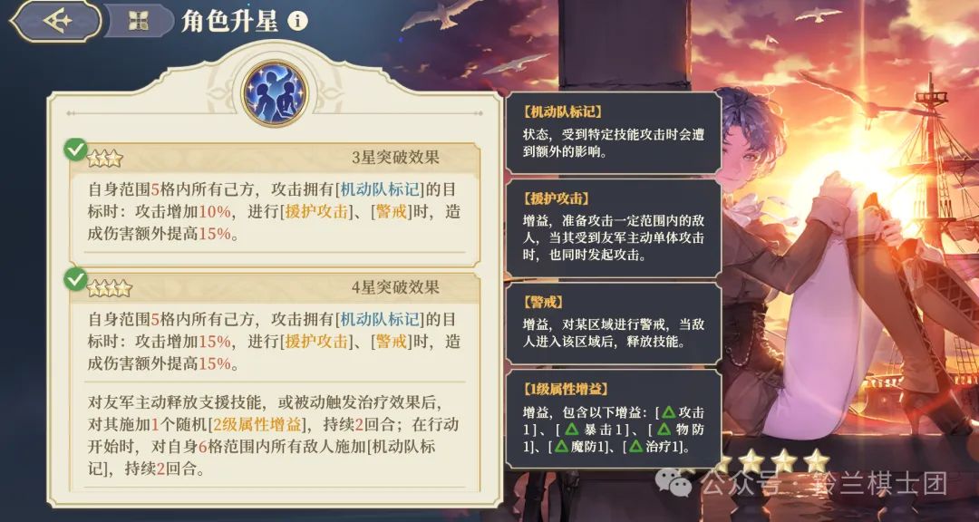 1~5星个性:侧影索菲亚个性围绕机动队标记、援护攻击、警戒增伤、附加增益等效果设计。个性主要可以通过给范围内敌方附加机动队标记,为援护、警戒角色提升伤害等,来提升输出位角色的伤害。