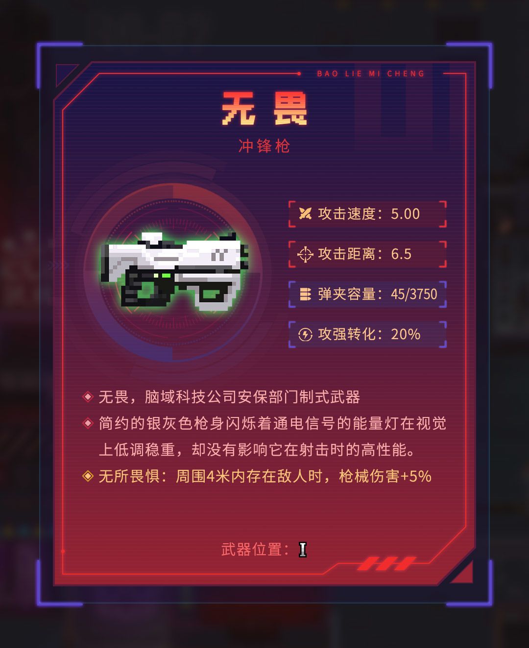 冲锋枪——无畏,正如其名,勇于冲锋,无所畏惧!攻击时离的范围越近,威力越大。周围4米内存在敌人时,枪械伤害+5%
