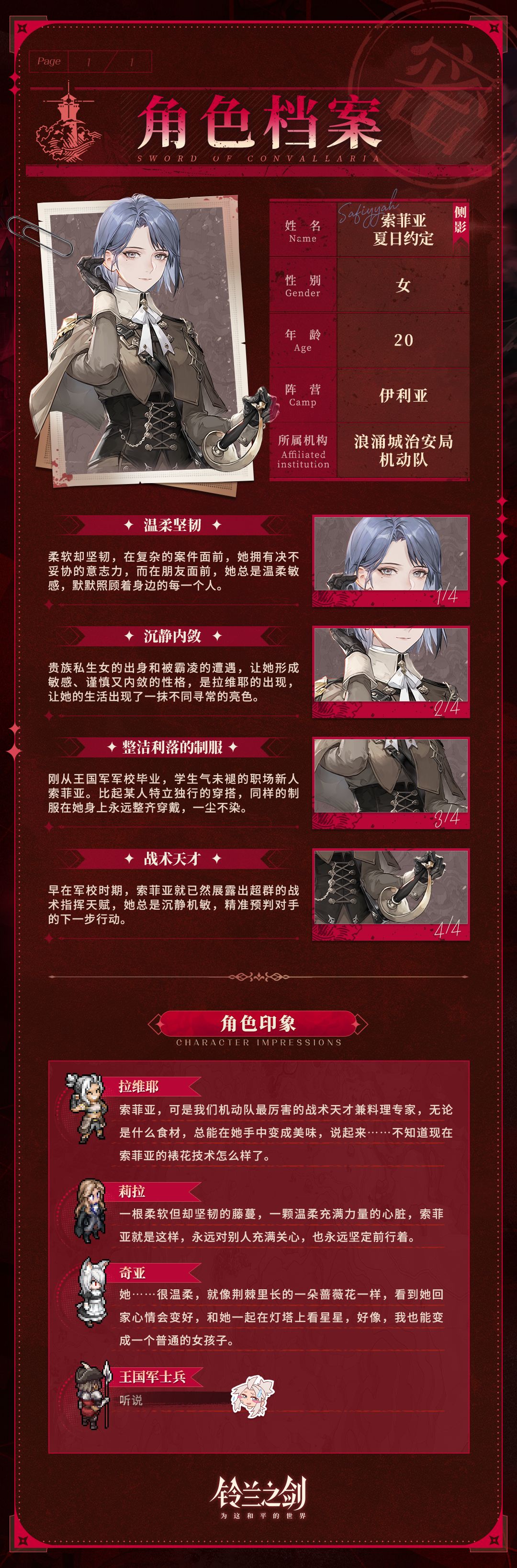早在王国军军校和拉维耶同窗的时期,索菲亚就已然展露出超群的战术指挥天赋。然而贵族私生女的出身和被霸凌的遭遇,让她形成沉静内敛、敏感谨慎的个性,是拉维耶的出现,让她的生活有了一抹亮色,将她从晦暗封闭的世界中救赎。毕业后两人继续并肩,加入了治安局机动队,立下共同守护浪涌城的誓约。