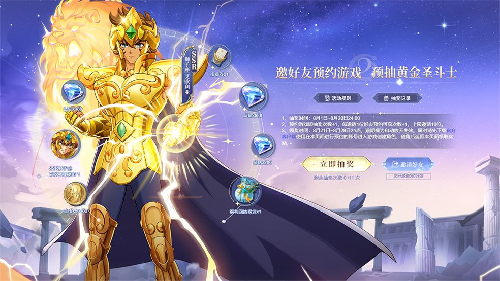 《圣斗士星矢:重生2》8月21日震撼公测,官服全网里程碑预约活动火热进行中,即刻参与活动:https://h5.mobage.cn/seiya2/pre-register/ 邀请好友预约,即可解锁更多抽奖次数,更有机会提前获得SSR角色——狮子座 艾欧利亚,先人一步组建强力阵容!