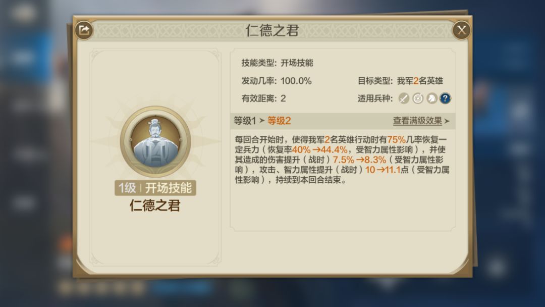 专属技能【仁德之君】:每回合开始时,使得我军2名英雄行动时有75%几率恢复一定兵力(恢复率40%→44.4%,受智力属性影响),并使其造成的伤害提升(战时)7.5%→8.3%(受智力属性影响),攻击、智力属性提升(战时)10→11.1点(受智力属性影响),持续到本回合结束。