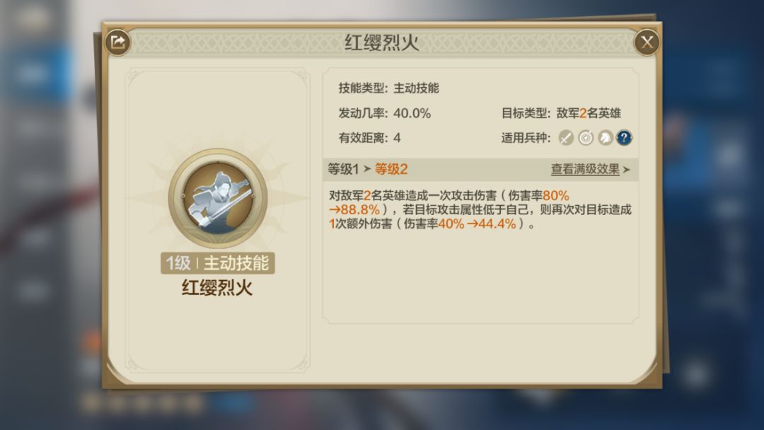 专属技能【红缨烈火】:对敌军2名英雄造成一次攻击伤害(伤害率80% →88.8%),若目标攻击属性低于自己,则再次对目标造成 1次额外伤害(伤害率40%→44.4%)。