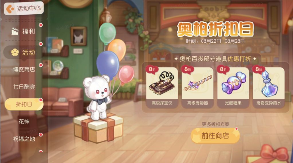 活动时间:8月22日5:00-8月28日23:59奥柏百货迎来了折扣大酬宾,活动期间,奥柏百货部分道具推出优惠打折活动,前来选购心动的商品吧!