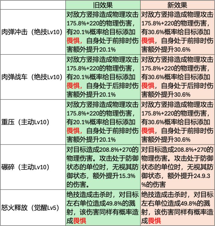熊的技能效果没有发生变化,但是概率和倍率均大幅上调。熊的伤害本来就很不错,改动之后又能上一个新台阶。而且现在绝技平均能造成1个单位畏惧,让熊有了比较稳定的控制能力。