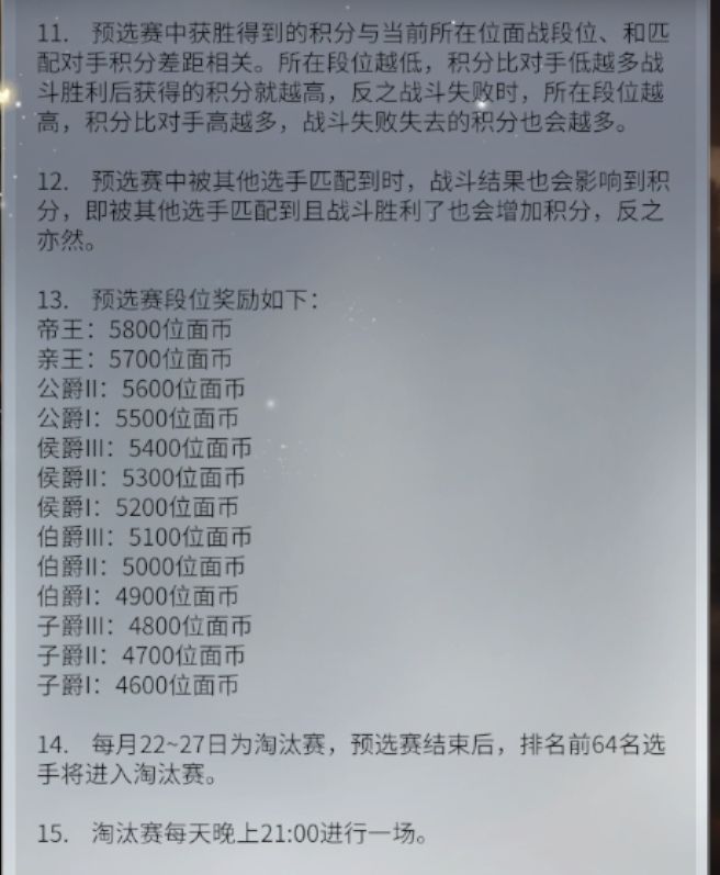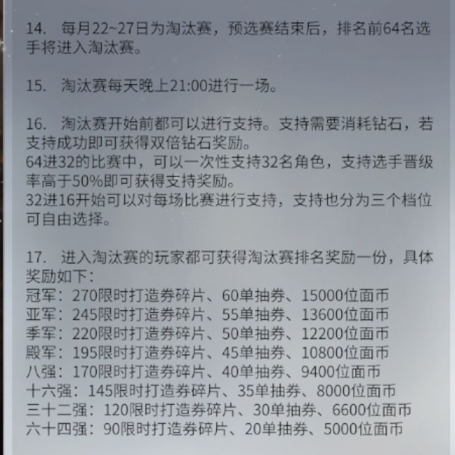 3,【淘汰赛】:玩家进入【预选赛】榜单64名后,就会自动获得【淘汰赛】资格。
