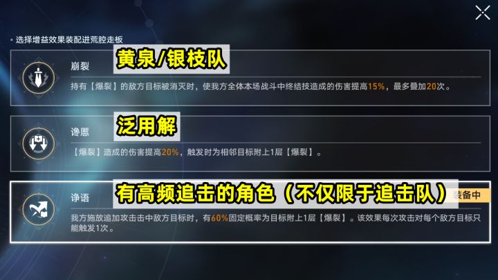来到队伍buff部分,上半和下半都是同样的三个buff:第一个适配黄泉和银枝等主打终结技输出的队伍;第二个相当于泛用解,如果不知道选什么或者队伍不适配其他两个buff,就选第二个;第三个是追加攻击同样有概率附上爆裂,有高频追击角色的队伍(不仅限于追击队)都可以用。