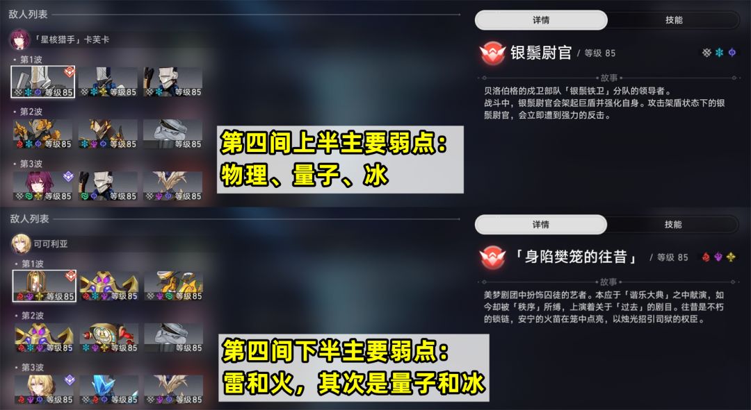 第四间上半boss是卡芙卡,其他精英怪还有银鬃尉官等等,主要弱点是物理、量子和冰,整体控制不算特别多,不过还是要注意卡芙卡的控制。下半boss是可可利亚,其余怪物有剧团三兄弟之一的蓄力怪、忆域迷因等等,主要弱点是雷、火,然后是量子和冰;和上半类似,控制主要集中在boss上,所以稍微注意下即可。