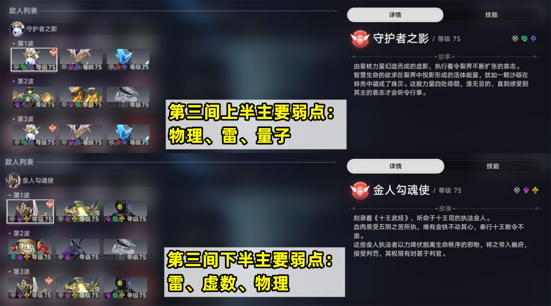 直接看第三间和第四间。第三间上半是守护者之影领衔,其他的话基本都是小怪,主要弱点是物理、雷和量子;下半精英怪是金人勾魂使,还有红绿灯等小怪,主要弱点是雷、虚数和物理。