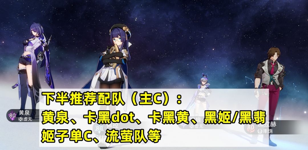 下半主要弱点是雷,所以像黄泉队、卡黑dot队、或者直接卡黑+黄泉的组合,以及练度比较高的景元队等等均比较推荐。其次因为同时有火、冰和量子弱点,那么黑姬组合或者黑翡组合都可以用,或者姬子单C也可以;但黑塔单C就不推荐了。最后还有流萤队等等。