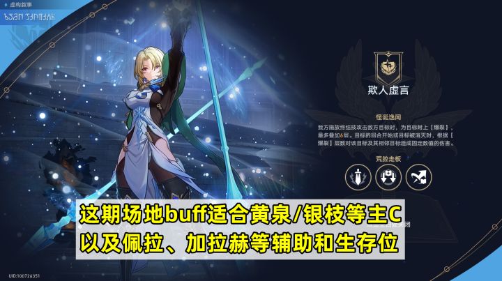 本期场地buff为终结技攻击敌方时,为目标附上【爆裂】效果,最多叠加6层。目标回合开始以及被消灭时,造成固定数值的扩散伤害。虽然伤害不算特别高,但用来清杂补刀相当好用。适配角色方面,除了像黄泉、银枝等主打终结技输出的主C外,终结技能攻击全部敌人的辅助和生存位同样很适配,包括但不限于佩拉、加拉赫、存护三月七、罗刹等等。