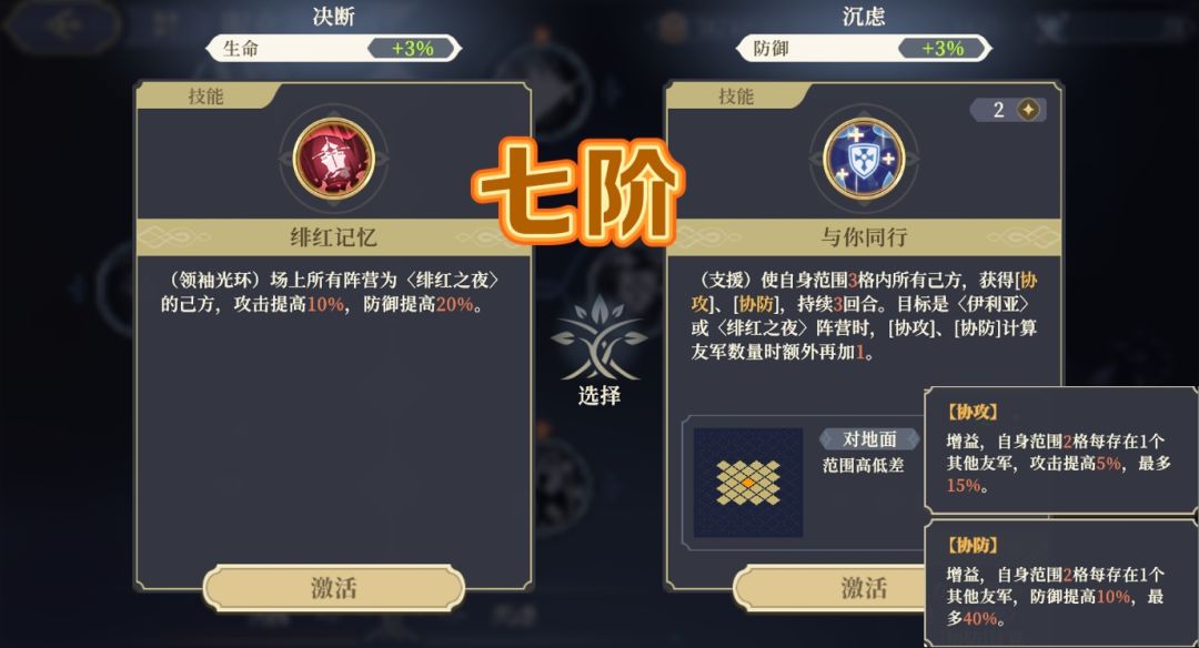 【七阶技能】左边小光环,右边技能和王女的协攻,协防有点类似,主要是【伊利亚】有特殊加成。