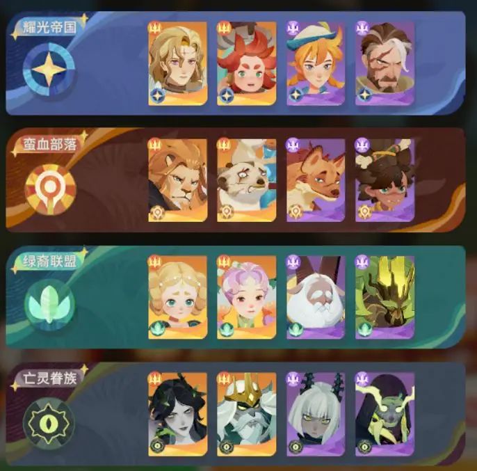 游戏英雄分为四个种族,受橡果限制,每个种族只能优先养成1-2个。