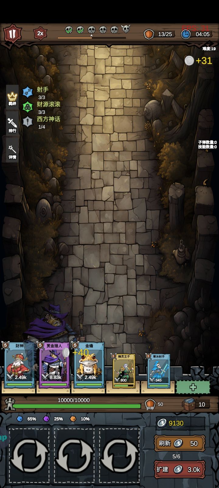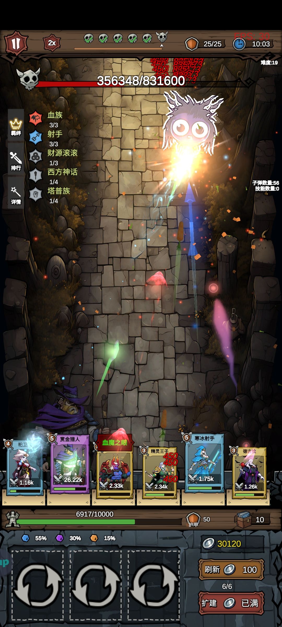 阵容就是血族,财源和射手,其余是凑数的,开局刷三财源攒钱,十级还是十五级前刷三射手过boss,之后给寒冰满级,精灵王子没必要,25波前卖掉财神和金蟾上三血族,之后boss就看脸了,我打的第一个boss死前还有两三千血而已