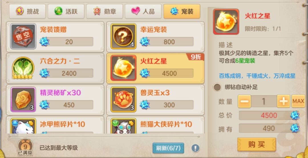 前期没开放火红的阶段宠装商城积分不要用,等能刷新出火红或者闪电的时候买火红闪电,积分有结余就买兽灵玉。闪电分解火红优先合六星宠物装备(开放二代宠物装备后再开始用火红)。