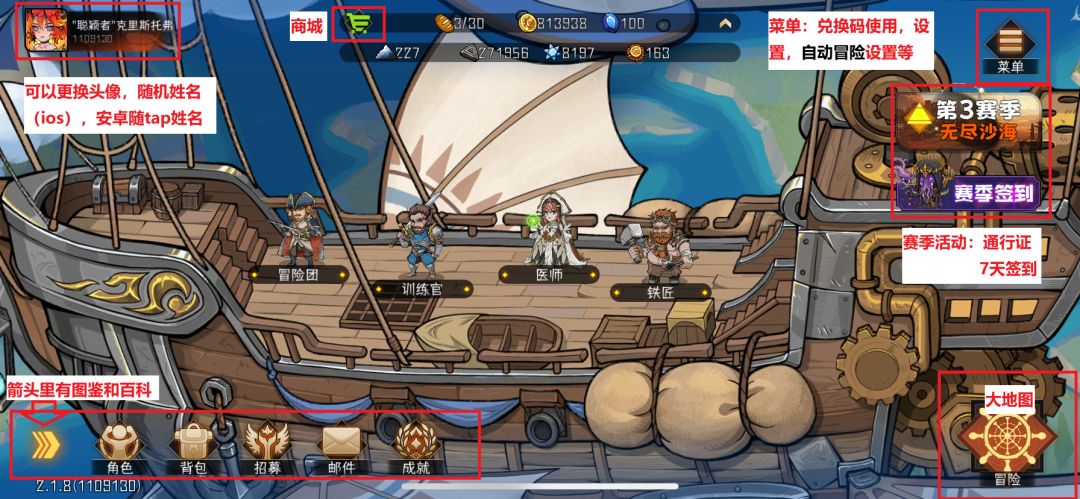 右上角的菜单,可以使用兑换码,设置自动冒险。下方是赛季活动。