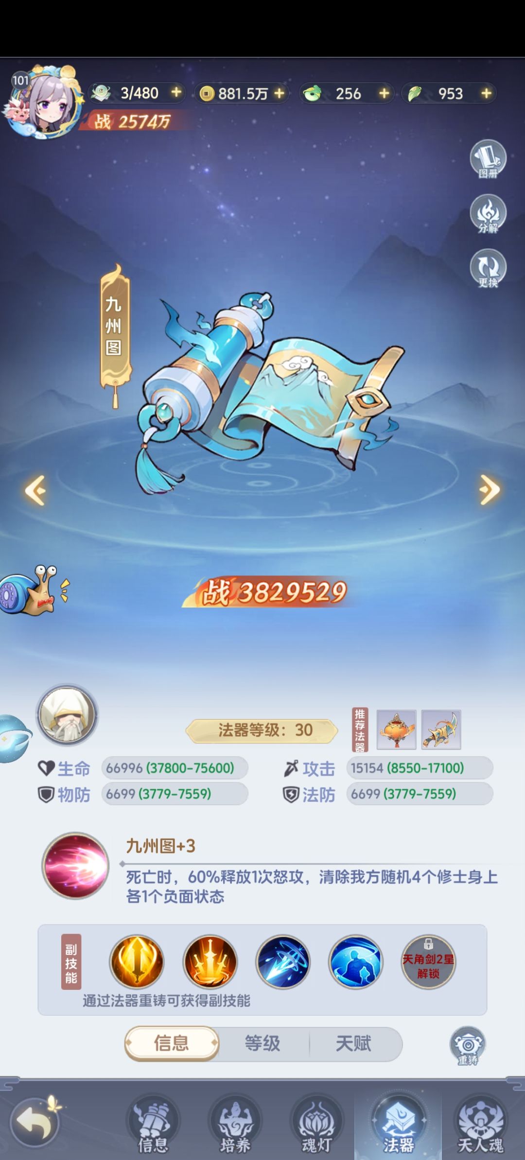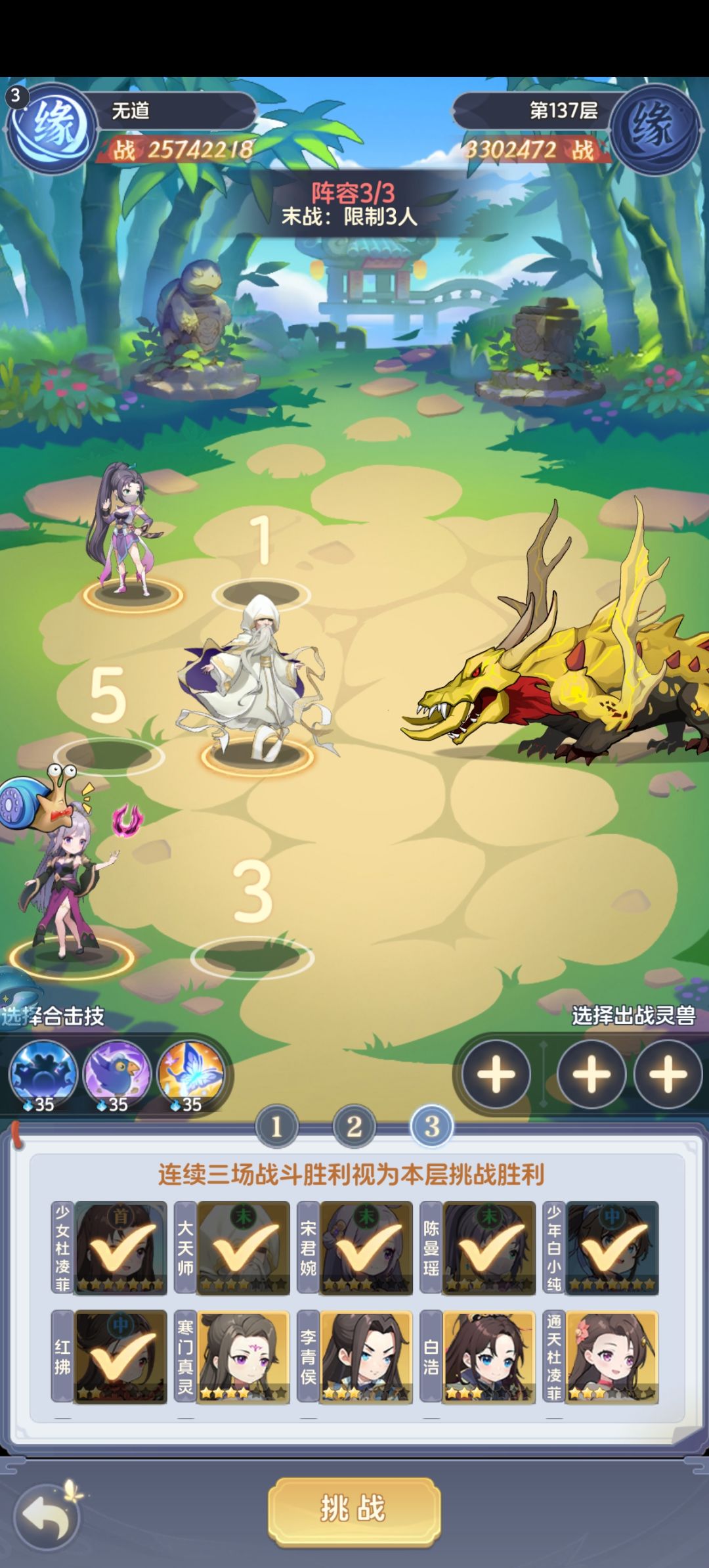 3星放在后排的情况下保底两个大招,法宝带九州图的话有概率3个大招