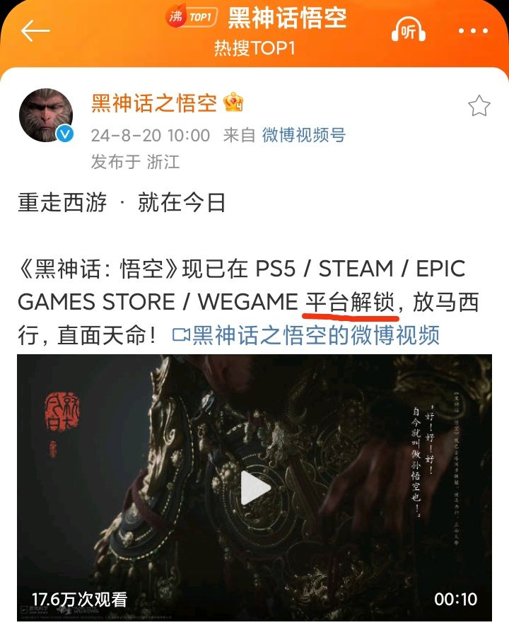 8/20上午十点整,《黑神话:悟空》已在 PS5 / STEAM / EPIC GAMES STORE / WEGAME 平台解锁❗❗❗