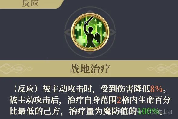 5阶反应技,右侧战地治疗相对更佳,享受被攻击受伤降低的同时,还能触发被动治疗效果,联动个性给队友挂增益(小尴尬再+1,这里治疗自己时,不能给自己挂增益)。