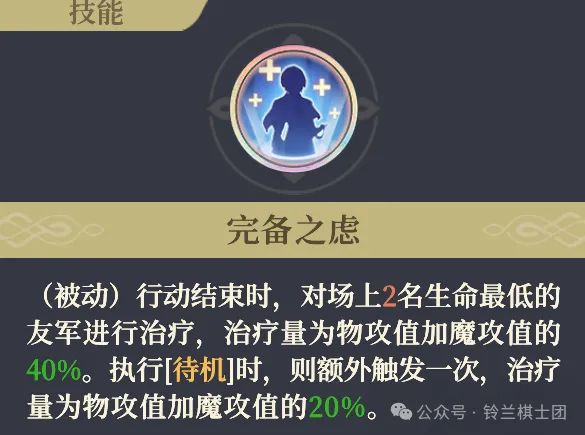 个性的对友军主动释放支援技能、或被动触发治疗效果后,对目标施加增益效果,包括自身被动技能完备之虑、反应技能影刃追击在内的众多治疗、支援技能,均可为友军高效刷增益效果。