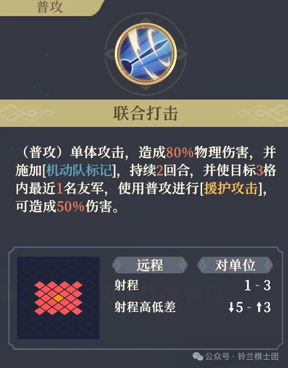 9阶普攻强化,左侧联合打击可以额外附加机动队标记,同时强制3格内最近一名友军使用普攻(50%)进行援护攻击。