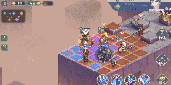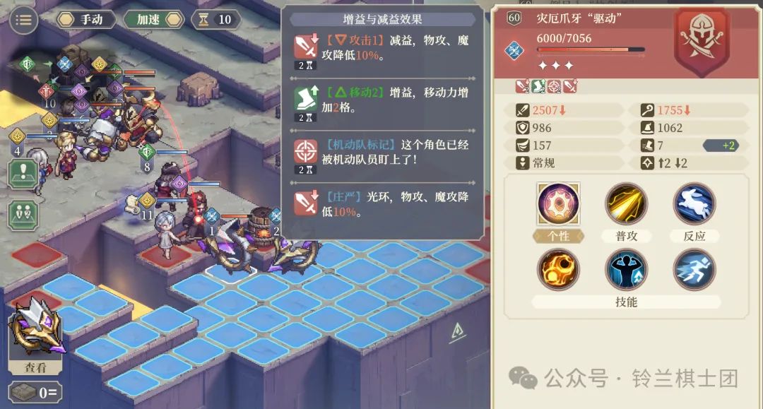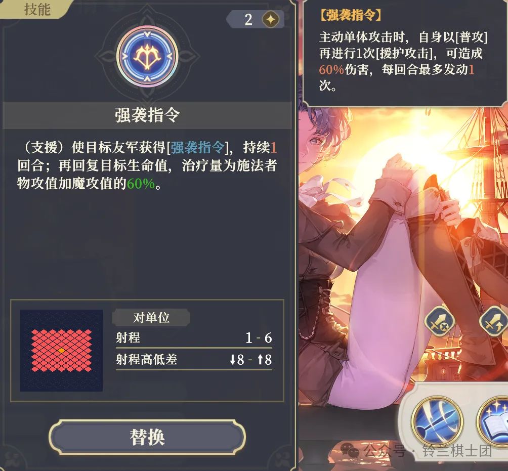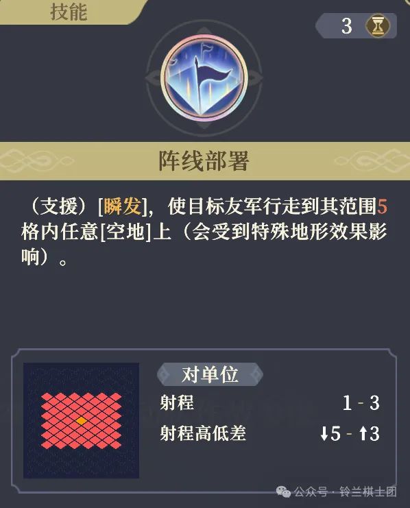 该技能的其他效果与门内基本一致,可以选择单体友军、移动5格,但移动过程会受燃烧等地形的额外消耗移动力等效果影响。算是一个单体小加速技能,同时可以联动个性、为友军附加增益效果。
