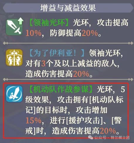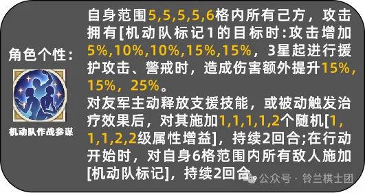 星级提升上,4星质变。4星对机动队标记作战的友军,攻击面板额外提升效果达到最大的15%,仅触发范围、对援护&警戒伤害提升伤略低于满星;附加增益状态也由1级增益提升为2级增益。