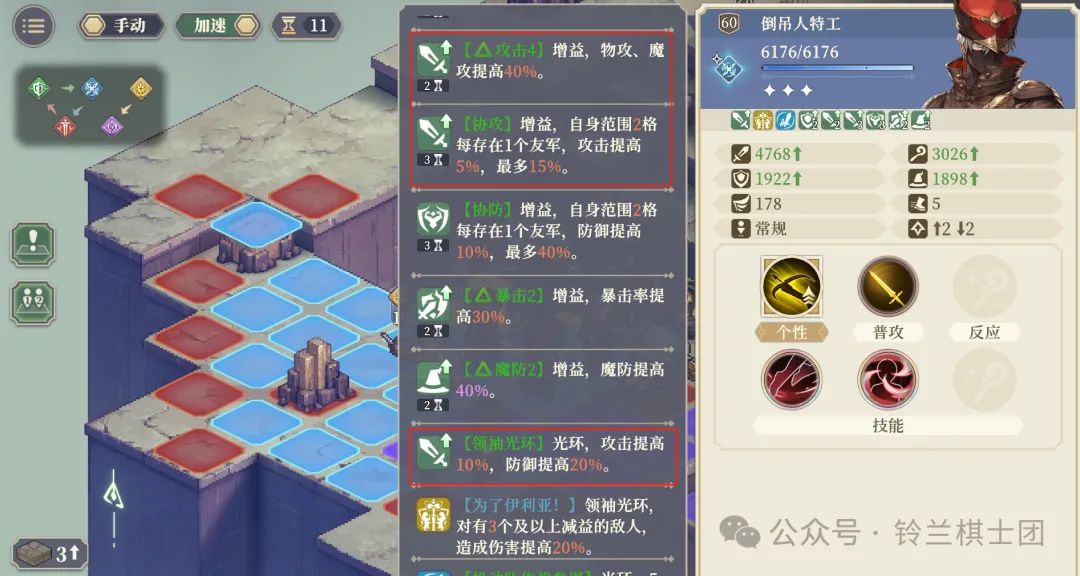 11阶左侧是侧影索菲亚的核心输出技能,可以先行给目标施加窥破弱点,其后强制3格内4名友军对目标发动援护攻击(50%伤害)。