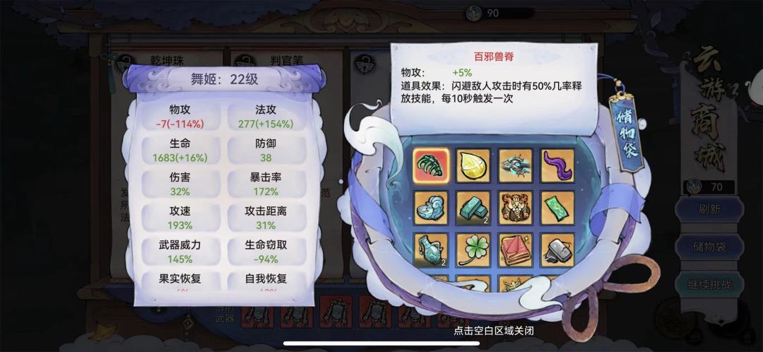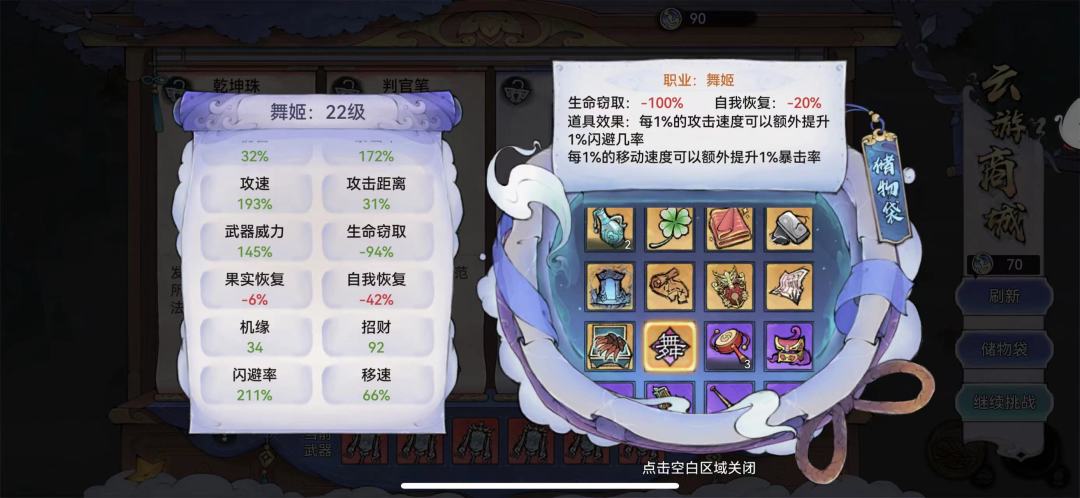 首先舞姬的特性,攻速额外加闪避,移速额外加暴击,就导致了越到后期舞姬的优点越明显。也成了最适配百邪兽脊的职业(为什么Pass隐士,虽然隐士天生闪避高,但是受伤会翻倍,前期极其容易暴毙,过度不丝滑。另外舞姬,升级找着攻速和移速加就可以,前期生存非常容易)