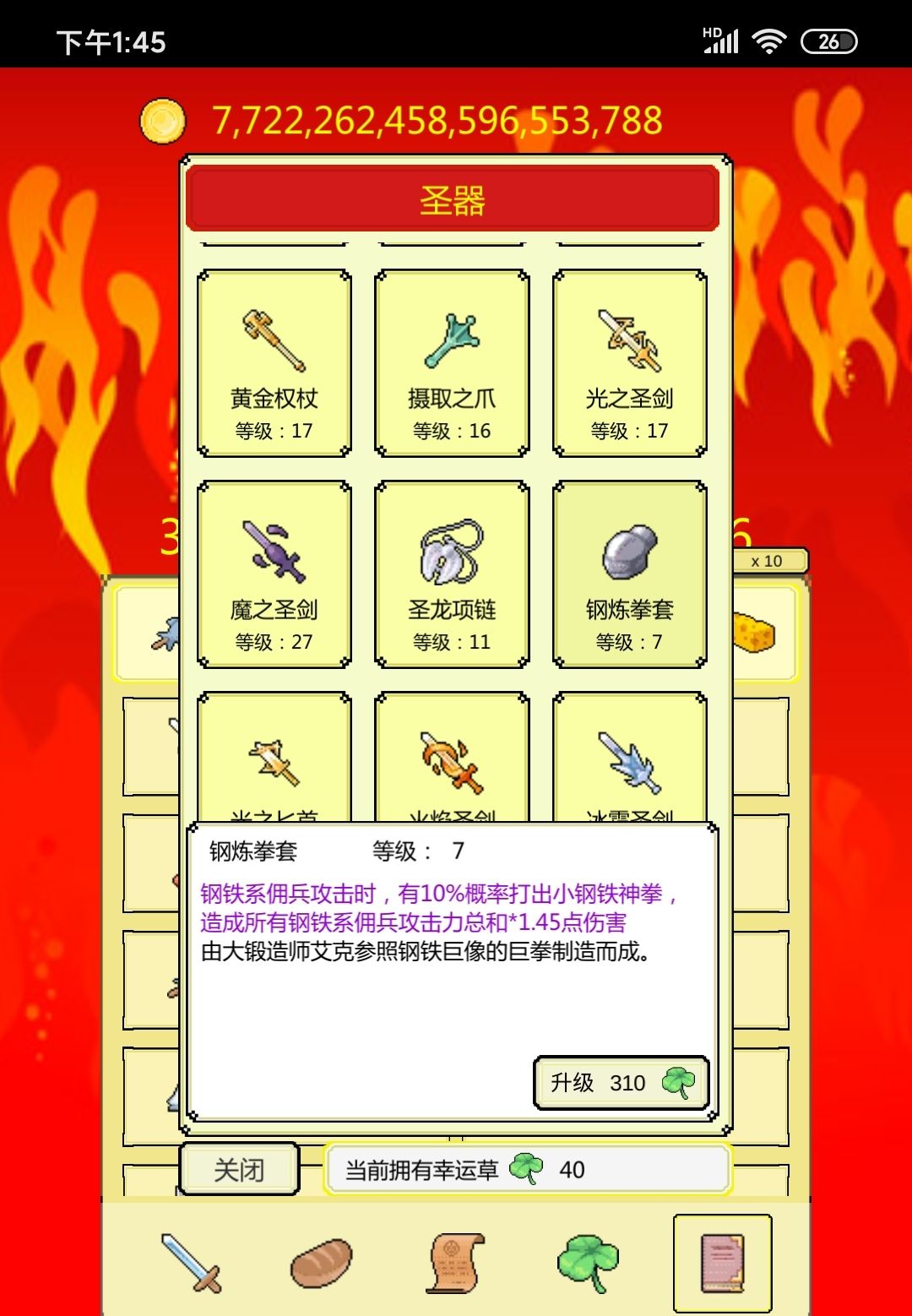 魔像115后,开始升火鸟,直到通关,这个阶段伤害纯靠烟雾战士,火鸟90级后,升圣天使攻速,我这个圣天使差4级100,否则伤害还能翻倍。圣天使最适合金鸡。
