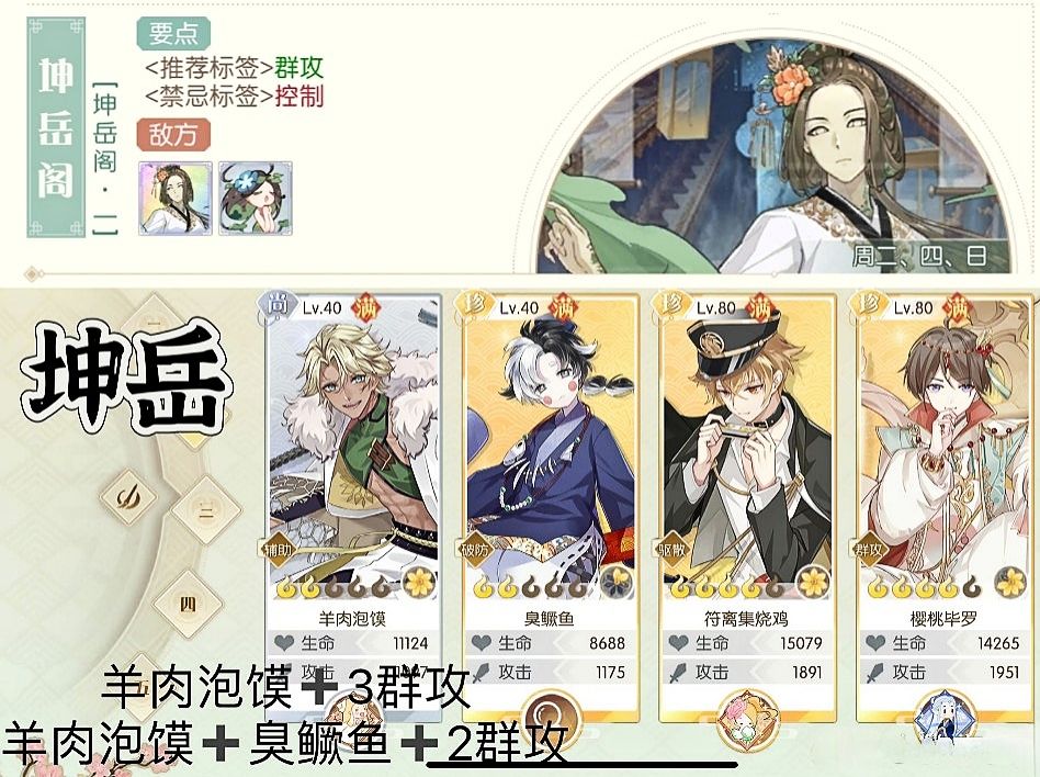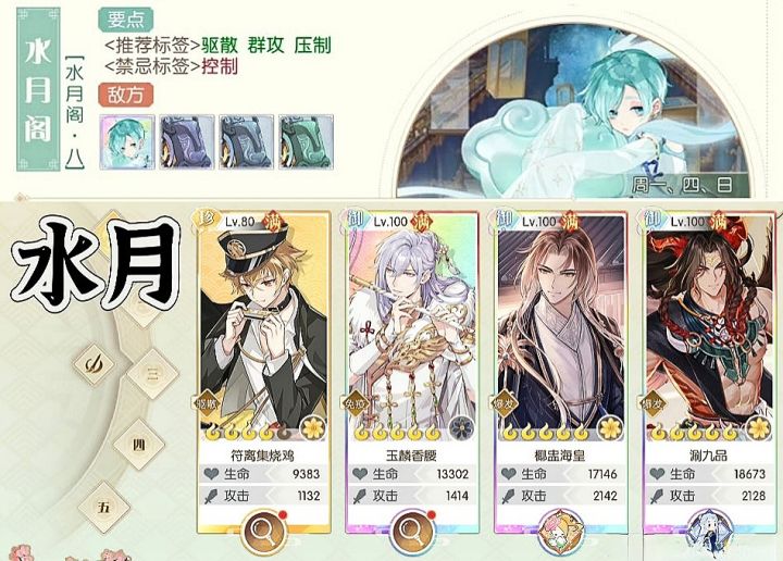 坤岳和水月需要带点输出,其他本对膳具无要求,拉到5星80级裸奔都能打