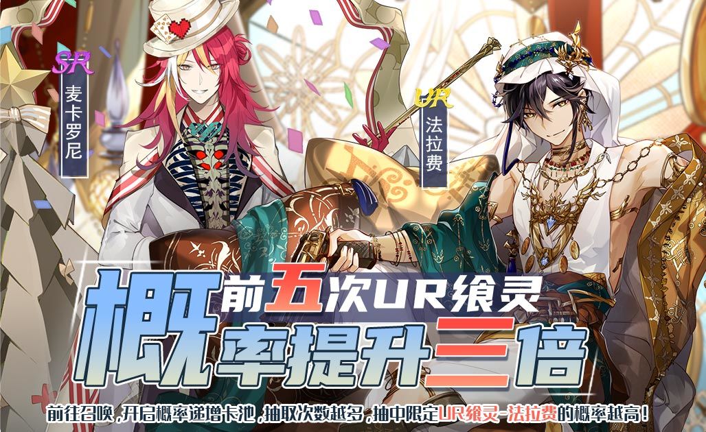 活动描述:活动期间,开启概率递增卡池,UR飨灵-法拉费和SR飨灵-麦卡罗尼限时加入卡池,御侍大人使用专属道具进行召唤,该卡池UR飨灵抽取概率大幅度提升,并且随着抽取次数的增多,UR飨灵-法拉费的抽取概率也会随之提升。