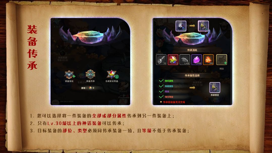 1. 传承结束后,传承装备将消失,目标装备所选对应属性将被覆盖,未选属性将被保留;