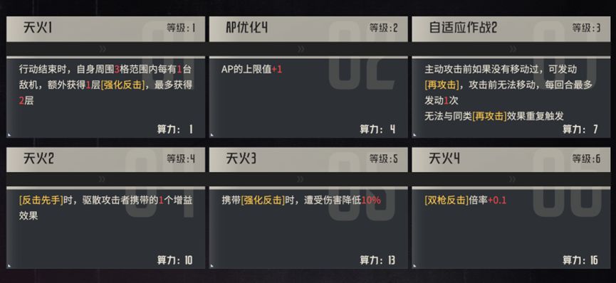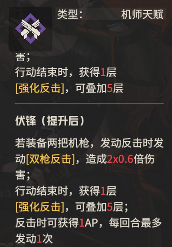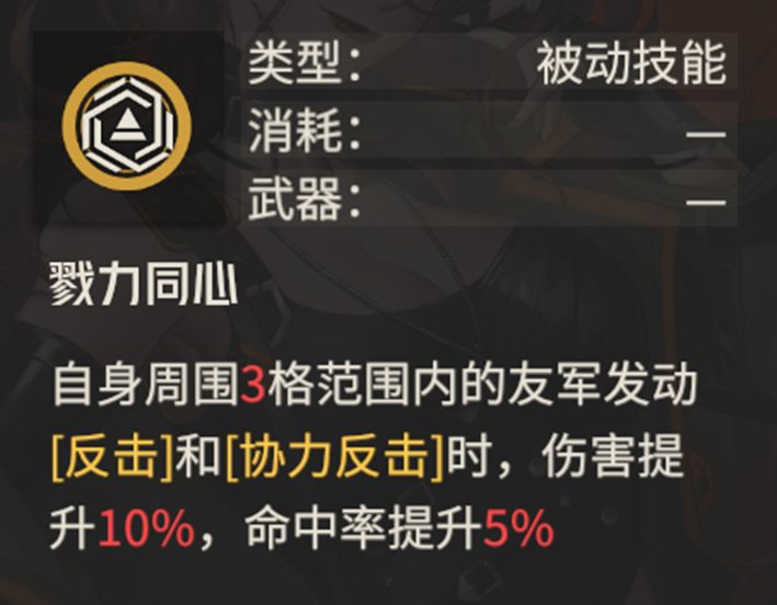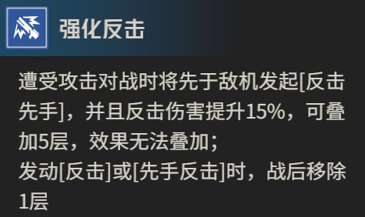 戮力同心:提高周围友军的反击能力,实际上大多数输出机师并不以反击为输出手段,对友军提升不明显