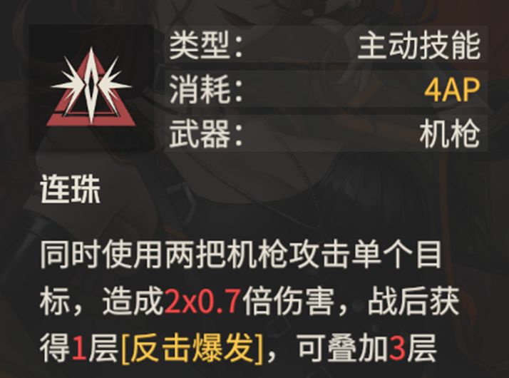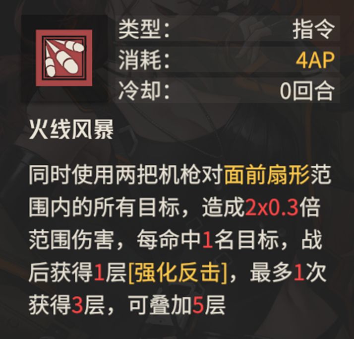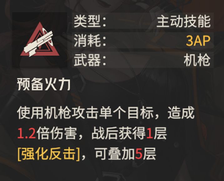 预备火力:从普通3ap机枪技能魔改而来,以降低0.1倍率为代价换取了1层强化反击