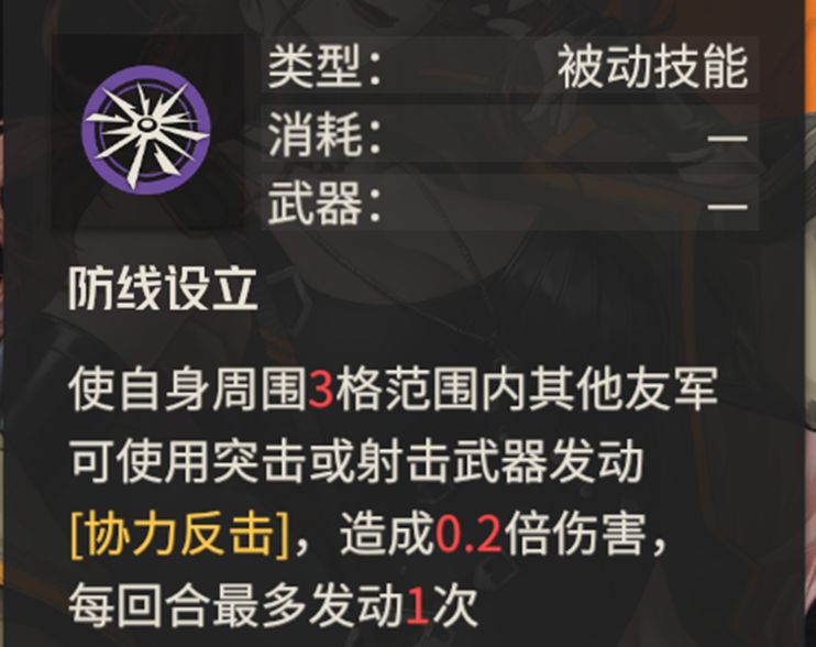 防线设立:让周围3格友军每回合获得1次获得协力反击能力,值得注意的是,友军反击后,卡夏不会触发协力反击,但是A友军反击后,B友军能够协力反击。每人仅能触发1次协力反击。