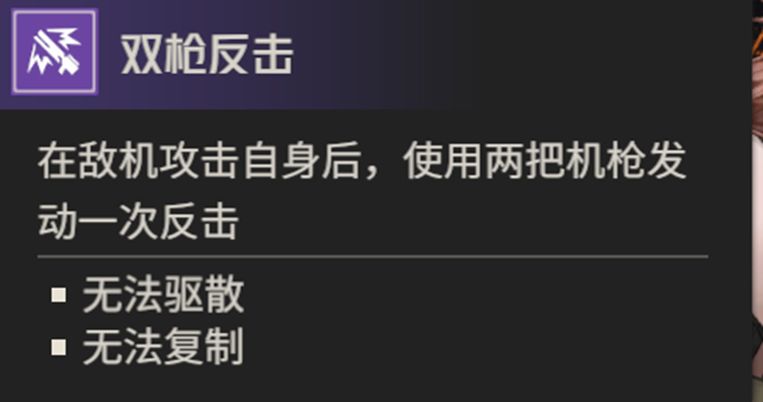 卡夏的天赋其实是一个说明书式的内容,从描述中我们可以看到“反击”二字频频出现,显然,卡夏是一个以反击能力见长的突击手。而这份强大的反击能力则是来源于两个特殊状态“双枪反击”和“强化反击“。”强化反击“即是遭受攻击对战时先于对手发动的伤害更高的反击,”双枪反击“则是同时使用两把机枪进行总体1.2倍率的反击。