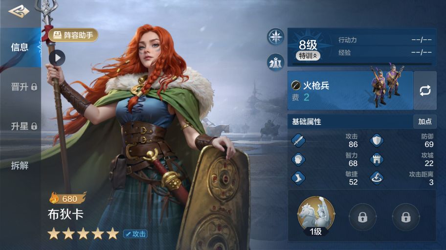 布狄卡是许多玩家都会抽到的一个英雄,自身面板不高,材料卡水平,但是自带技能的机制可圈可点,前四回合免控,在理想条件下能够撑过制敌机先、全境封锁、兵权谋、销兵偃武等技能的控制;以及自带技能满级后,每发动一次技能可以增伤5%,可叠加至战斗结束。