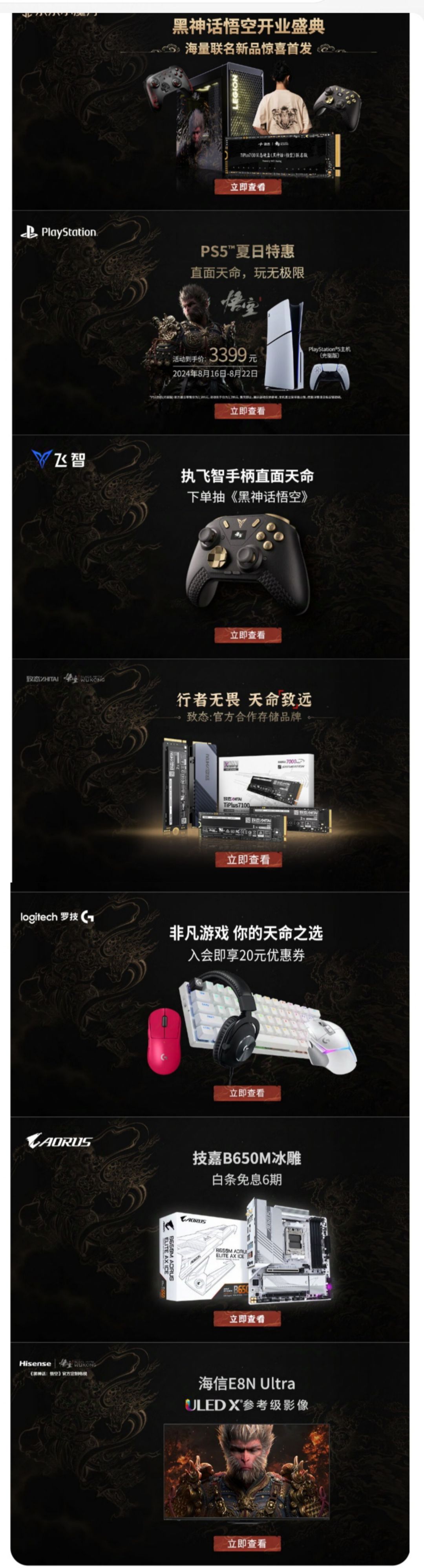 电子产品方面,联想拯救者推出了《黑神话:悟空》联名定制版硬件,包括拯救者Y9000游戏本、拯救者刃7000K主机和拯救者C170适配器。此外,致态TiPlus7100固态硬盘也推出了《黑神话:悟空》联名版,提供1TB和2TB两种容量可选。