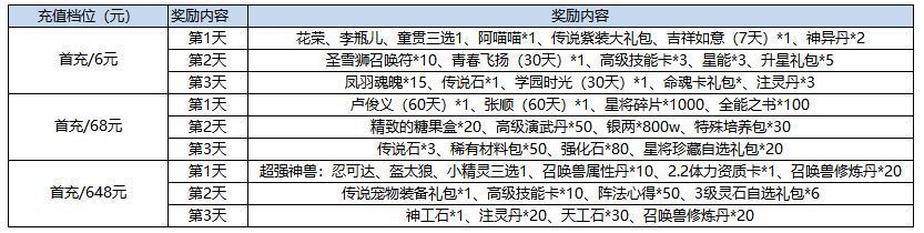活动五:首充礼包活动内容:水粉们首次充值任意金额即可领取价值丰厚的首充礼包。