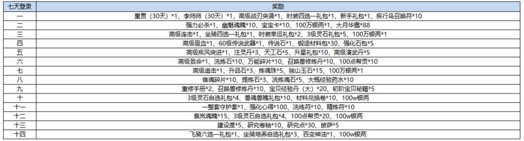 活动一:14天登录送豪礼活动内容:新服期间,水粉们每天登录即可领取坐骑、翅膀、传说装备等丰盛奖励。