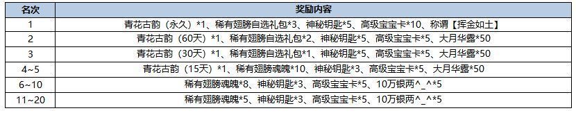 活动描述:活动结算时,充值前20名玩家可以获取丰厚奖励哦~