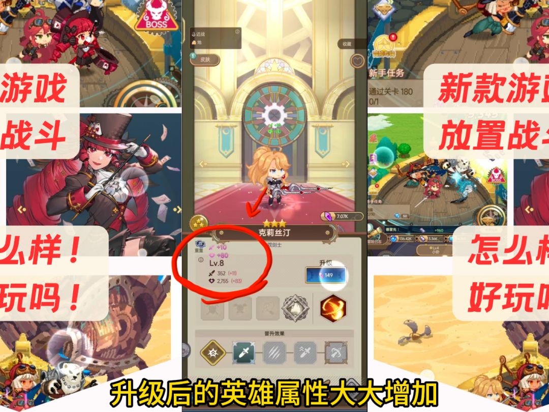 (噢噢忘说了,升级就是你不断的打卡关boss,过了你就能升级了,所以前期你拉一下战斗画面下面的那些属性就可以了,升级英雄真的不太急啊,浅浅升级一下就行啦!!比心~)