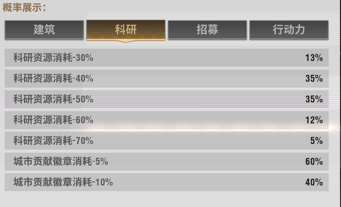 指挥官可以在【建筑、科研、招募和行动力】中自选主题进行抽奖,抽奖可获得5%-60%的不同的资源减免折扣,活动期间首次抽奖免费。