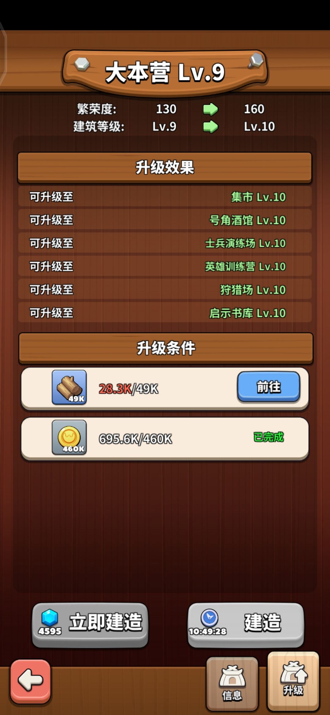 建筑升级问题:一直升本,升到十,把酒馆拉到十,开启英雄巡防即可 可以按照升本的最低要求来一直拉,如下图
