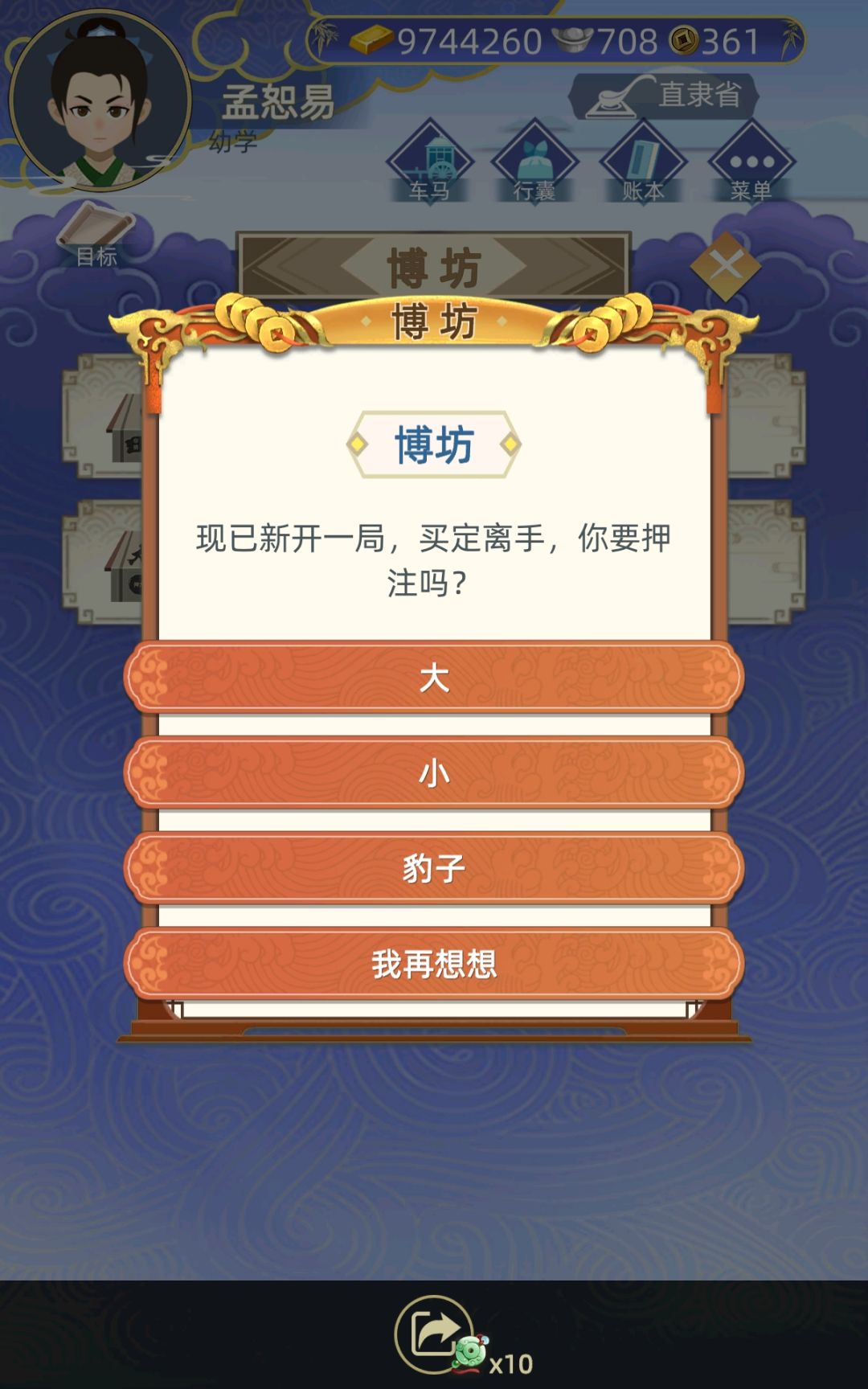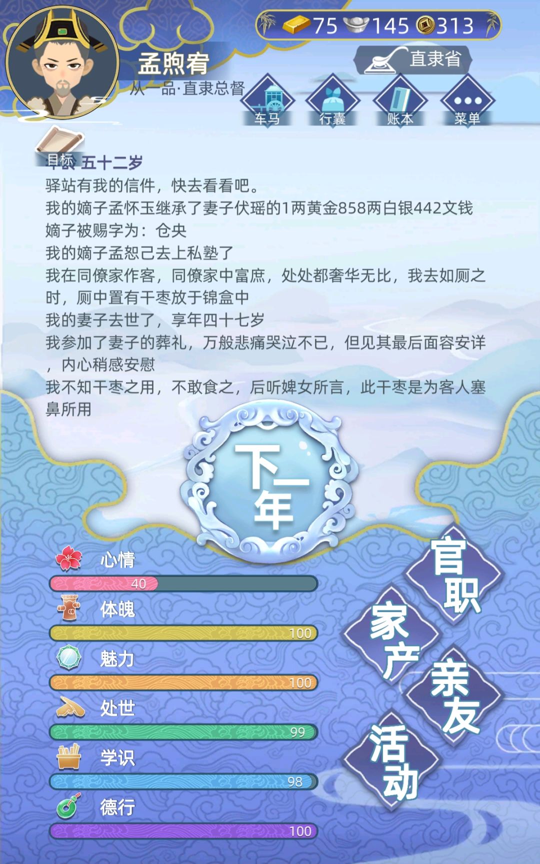 本来天塌了的,然后默默的安慰完自己重新开局。。。。但是重新赚钱太累了,当官传代每一代最多也就几十黄金,种地来钱比当官多一点,但是前期的地不多,而且本金也不是很够