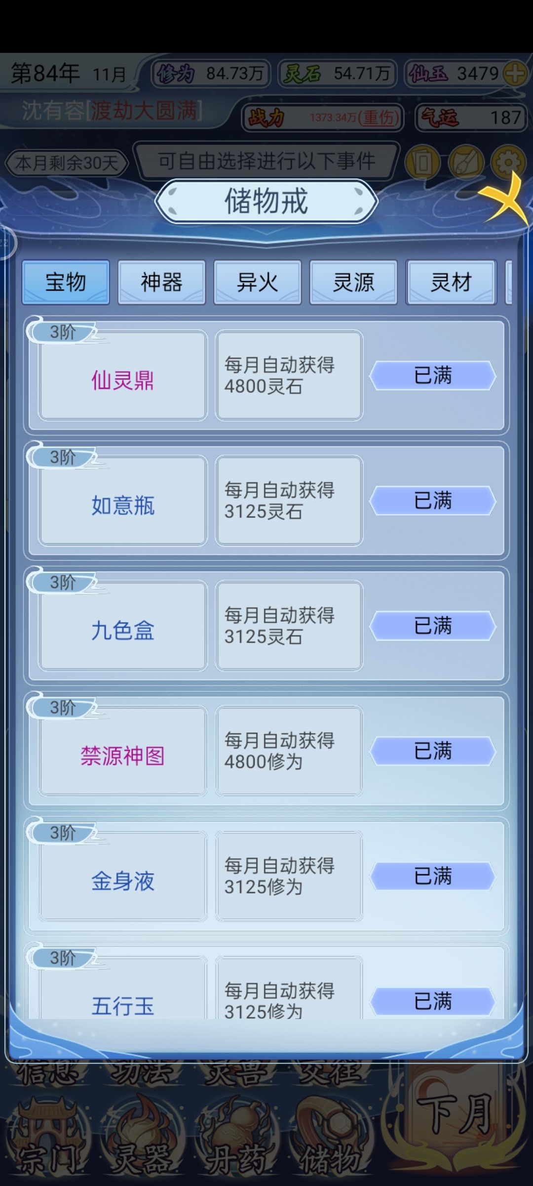 都收集满了,其他的能加战力出来炼丹、魔窟、禁地等,以及与好友切磋、结拜,其他功法、魔兽、武器、神器都满了。就那个宗门身份只提到荣耀弟子。腻了,就这样啦