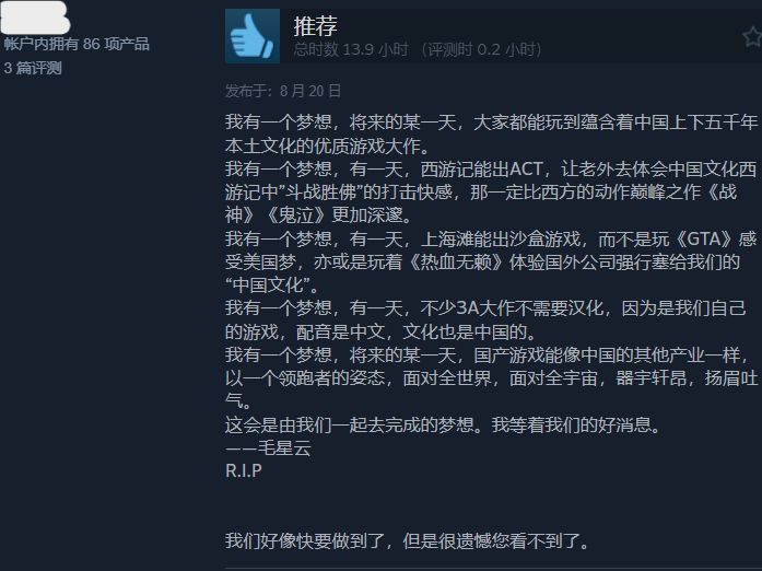 !下面我们来看看那些好评怎么说的。图一评价:”我有一个梦想,将来的某一天,大家都能玩到蕴含着中国上下五千年本土文化的优质游戏大作。我有一个梦想,有一天,西游记能出ACT,让老外去体会中国文化西游记中'斗战胜佛'的打击快感,那一定比西方的动作巅峰之作《战神》《鬼泣》更加深邃。我有一个梦想,有一天,上海滩能出沙盒游戏,而不是玩《GTA》感受美国梦,亦或是玩着《热血无赖》体验国外公司强行塞给我们的'中国文化'。我有一个梦想,有一天,不少3A大作不需要汉化,因为是我们自己的游戏,配音是中文,文化也是中国的。我有一个梦想,将来的某一天,国产游戏能像中国的其他产业一样,以一个领跑者的姿态,面对全世界,面对全宇宙,器宇轩昂,扬眉吐气。这会是由我们一起去完成的梦想。我等着我们的好消息。——毛星云