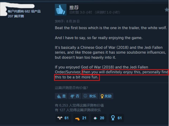 图二为老外评价,最后还说比起其他3A游戏,黑神话更好玩,全文大致意思为:我已经击败了预告片中的第一个boss——那只白色的狼。我不得不说,到目前为止,我真的很享受这个游戏。《黑神话:悟空》基本上算是中国的战神(2018)和绝地武士系列,它和这些游戏一样,能够触及灵魂深处,但并不会给你太多沉重感。如果你喜欢《战神》(2018)、《绝地陨落的武士团》或者《幸存者》,那么你也一定会喜欢这部作品,从我个人而言,我觉得《黑神话:悟空》要更好玩。