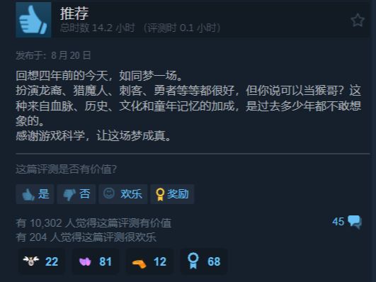 图三评价说:”回想四年前的今天,如同梦一场。扮演龙裔、猎魔人、刺客、勇者等等都很好,但你说可以当猴哥?这种来自血脉、历史、文化和童年记忆的加成,是过去多少年都不敢想象的。感谢游戏科学,让这场梦成真。“