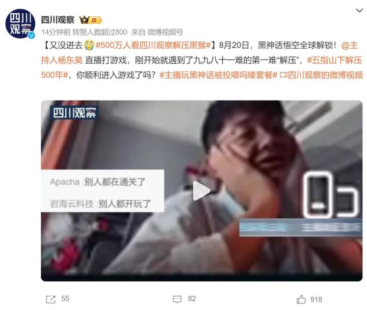 【四川观察】是具备媒体资质的地方媒体,《黑神话》破圈这个热度当然要蹭上,其中的直播小插曲就是因为内存安装的问题不得不直播卸载《原神》。